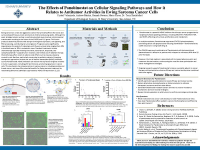 Ewing sarcoma is a rare and aggressive cancer that primarily affects the bones and surrounding soft tissues, most commonly in children and young adults. Although the exact etiology remains unclear, a well-documented cause involves a chromosomal translocation resulting in the fusion of the EWSR1 and FLI1 genes. This fusion produces abnormal proteins that disrupt normal gene expression, cell signaling, and RNA processing, contributing to tumorigenesis. Prognosis varies significantly depending on the extent of metastasis, with 5-year survival rates ranging from 82% in localized cases to 39% in metastatic cases. Standard treatments include chemotherapy typically involving vincristine, doxorubicin, etoposide, and cyclophosphamide—surgical tumor resection, and limited use of radiation therapy. Chemotherapy often results in adverse side effects such as nausea, alopecia, mucositis, and diarrhea, particularly concerning in pediatric patients. Emerging therapeutic approaches include the use of histone deacetylase (HDAC) inhibitors such as Panobinostat. HDAC inhibition can restore the expression of genes involved in tumor suppression, including p53 and histones, promoting apoptosis in cancer cells. This mechanism has shown promise in various cancers, including prostate and breast cancer, and may offer potential benefits for Ewing sarcoma treatment by reactivating antitumor pathways suppressed by HDAC overexpression.