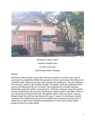 The House on Marcos Street, a house that’s been in my family for over forty years, is one of many homes in a neighborhood filled with generations of stories and memories that influence the community today. Many memories have been created in this small home -- from the realization of my ancestors’ dreams to the hardships of reality. The families within this neighborhood have seen joy and suffering just like my own family. This neighborhood is constantly changing, affecting the people who call this community home. Today this community changes through the increase of gentrification, the decrease of livable homes. and the negative connotations others in San Antonio have towards the West Side. Through this exhibit, I tell a story about a common Hispanic family whose life has been shaped in this space. I connect it to the changes currently occurring in this neighborhood, because as the neighborhood is changing, the people who live within it have a right to know about these transformations. For this reason, history and the present are interwoven in this exhibit.