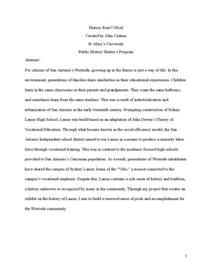 For citizens of San Antonio’s Westside, growing up in the Barrio is just a way of life. In this environment, generations of families share similarities in their educational experiences. Children learn in the same classrooms as their parents and grandparents. They roam the same hallways, and sometimes learn from the same teachers. This was a result of industrialization and urbanization of San Antonio in the early twentieth century. Prompting construction of Sidney Lanier High School, Lanier was build based on an adaptation of John Dewey’s Theory of Vocational Education. Through what became known as the social efficiency model, the San Antonio Independent school district aimed to use Lanier as a means to produce a minority labor force through vocational training. This was in contrast to the academic focused high schools provided to San Antonio’s Caucasian population. As a result, generations of Westside inhabitants have shared the campus of Sydney Lanier, home of the “Voks,” a mascot connected to the campus’s vocational emphasis. Despite this, Lanier contains a rich sense of history and tradition, a history unknown or recognized by many in the community. Through my project that creates an exhibit on the history of Lanier, I aim to build a renewed sense of pride and accomplishment for the Westside community.