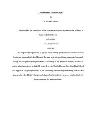 The purpose of this project is to expand Public History practices in the community of the Southwest Independent School District. Its main goal is to establish a community historical society that will preserve and promote the local history of the area while allowing students to gain practical experience in the field. A newly created Public History class at the High School will support it. By giving members of the community the knowledge and ability to record and preserve their local history, the power to keep alive the collective memory is in the hands of those who made this area their home.