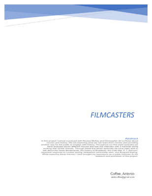 In this project I cohost a podcast with Nicolas McKay and Christopher de La Rosa about movies and history. We are exploring what we can learn from movies and providing another way for the public to engage with history. Throughout our first eight episodes we have analyzed seven different movies and had one interview with a historian doing working with similar themes. Through these first seven episodes we have been able to talk about the Texas Borderlands, the history of Broadway, the Cold War, P. T. Barnum, Japanese response to nuclear testing, Hollywood censorship laws, and Rudyard Kipling. While exploring these themes I have brought my experience as a public historian to the research and promotion of this project.