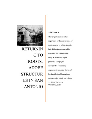 This project articulates the importance of the preservation of adobe structures in San Antonio. In it, I identify and map adobe structures that remain today using an accessible digital platform. This project incorporates community engagement including stories of local residents of San Antonio and providing public workshops.