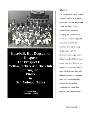 The Prospect Hill Yellow Jackets Athletic Club was an important institution in San Antonio’s West Side in the 1960’s. It was a vehicle through which the emerging Mexican American middle-class families integrated and acculturated into the American mainstream. Using images, maps, archival photographs, newspaper articles, obituaries, and oral histories, this project presents evidence on how organized youth sports played a major role in helping shape and define the identity of a Mexican American community in San Antonio and provided the foundation that spawned an engaged generation of achievers.