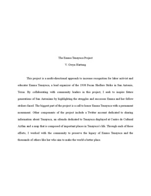 This project is a multi-directional approach to increase recognition for labor activist and educator Emma Tenayuca, a lead organizer of the 1938 Pecan Shellers Strike in San Antonio, Texas. By collaborating with community leaders in this project, I seek to inspire future generations of San Antonians by highlighting the struggles and successes Emma and her fellow strikers faced. The biggest part of the project is a call to honor Emma Tenayuca with a permanent monument. Other components of the project include a Twitter account dedicated to sharing information about Tenayuca, an ofrenda dedicated to Tenayuca displayed at Centro de Cultural Aztlan and a map that is composed of important places in Tenayuca’s life. Through each of these efforts, I worked with the community to preserve the legacy of Emma Tenayuca and the thousands of others like her who aim to make the world a better place.