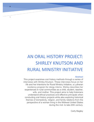 This project examines oral history methods through a series of interviews with Shirley Knutson. These interviews focus on her life and her intentions for Rural Ministry Initiative, a Lutheran residency program for clergy interns. Shirley describes her experiences in rural communities as a child, student, teacher, wife, and mother. This project aims to help historians understand ethical practices and effective principals when conducting oral history projects while also exploring historical themes of domesticity, religion, and family relations from the perspective of a woman living in the Midwest United States during the mid- to late-20th century.
