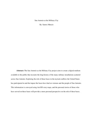 The San Antonio as the Military City project aims to create a digital medium available to the public that recounts the long history of the many military installations scattered across San Antonio. Exploring the role of these bases in the myriad conflicts the United States has participated in and the impact the bases have had on veterans and the people of San Antonio. This information is conveyed using ArcGIS story maps, and the personal stories of those who have served on these bases will provide a more personal perspective on the role of these bases.