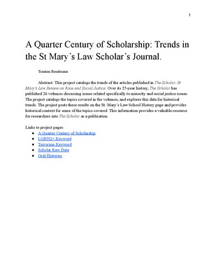 This project catalogs the trends of the articles published in The Scholar: St Mary’s Law Review on Race and Social Justice. Over its 25-year history, The Scholar has published 26 volumes discussing issues related specifically to minority and social justice issues. The project catalogs the topics covered in the volumes, and explores this data for historical trends. The project posts these results on the St. Mary’s Law School History page and provides historical context for some of the topics covered. This information provides a valuable resource for researchers into The Scholar as a publication.
