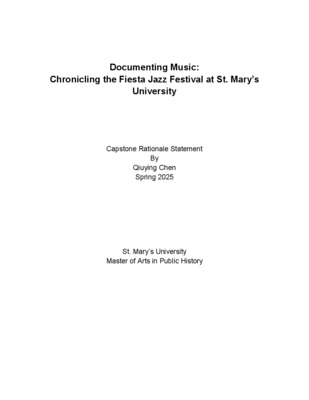 “Documenting Music: Chronicling the Fiesta Jazz Festival at St. Mary’s University” records memories of the Fiesta Jazz Festival at St. Mary’s University and provides a detailed history of the festival since 1962. Through archival visits, newspaper articles, photos, as well as oral interviews of the Jazz Studies Directors and the volunteer coordinator, the project shares the history of the festival’s structure and organizing efforts. Moreover, the project highlights the festival’s performance information, guest artists, the preparation process, and organizers’ experiences throughout the decades. This project preserves the history for the Music Department and its student community at St. Mary’s University, recording the history of the festival for the first time. By sharing this history, this project connects St. Mary’s students, staff and faculty into a more united community, while also adding to the history of jazz in San Antonio.