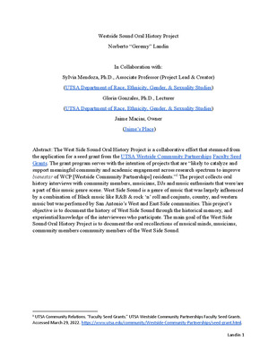 The West Side Sound Oral History Project is a collaborative effort that stemmed from the application for a seed grant from the UTSA Westside Community Partnerships Faculty Seed Grants. The grant program serves with the intention of projects that are “likely to catalyze and support meaningful community and academic engagement across research spectrum to improve bienestar of WCP [Westside Community Partnerships] residents.” The project collects oral history interviews with community members, musicians, DJs and music enthusiasts that were/are a part of this music genre scene. West Side Sound is a genre of music that was largely influenced by a combination of Black music like R&B & rock ‘n’ roll and conjunto, country, and western music but was performed by San Antonio’s West and East Side communities. This project’s objective is to document the history of West Side Sound through the historical memory, and experiential knowledge of the interviewees who participate. The main goal of the West Side Sound Oral History Project is to document the oral recollections of musical minds, musicians, community members community members of the West Side Sound.