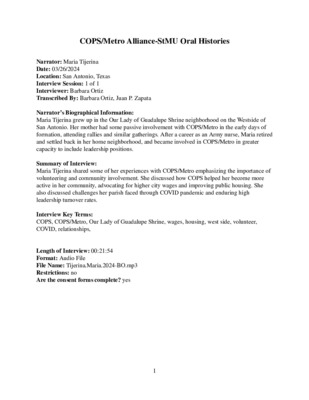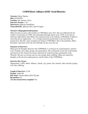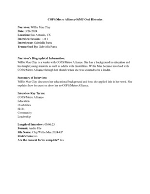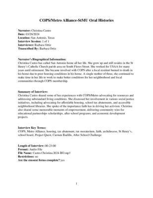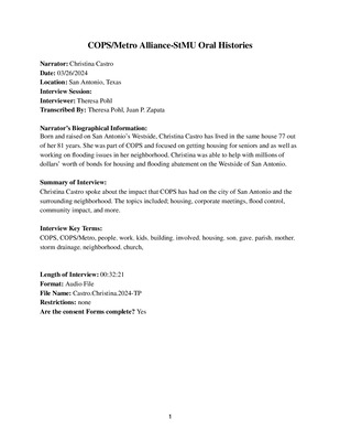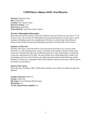 This collection of oral histories is a small moment of documenting the work and impact of COPS/Metro Alliance, a grassroots community organization based in San Antonio, Texas. The interviews highlight the group's efforts to advocate for social and economic equity, civic engagement, and community-led development. The collection serves as a resource for those studying faith-based organizing, local activism, and public policy in South Texas. To learn more about COPSMetro, please visit href="https://www.copsmetro.com/