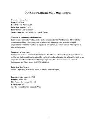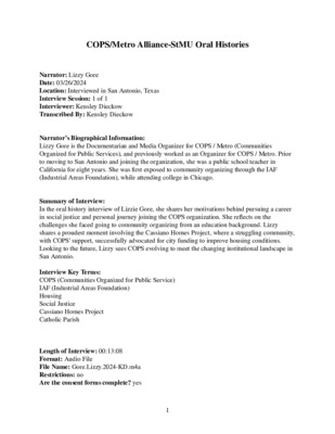In the oral history interview of Lizzie Gore, she shares her motivations behind pursuing a career in social justice and personal journey joining the COPS organization. She reflects on the challenges she faced going to community organizing from an education background. Lizzy shares a proudest moment involving the Cassiano Homes Project, where a struggling community, with COPS' support, successfully advocated for city funding to improve housing conditions. Looking to the future, Lizzy sees COPS evolving to meet the changing institutional landscape in San Antonio.