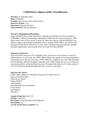In the oral history interview of Sr. Gabriella Lohan, she discusses San Antonio’s social and political history, as well as the role COPS / Metro Alliance has played in reaching marginalized communities across the city. Over time, COPS / Metro has adapted to new issues like education and fair banking, reflecting changing community needs while staying true to its core mission of empowering citizens and promoting democracy. Throughout the interview, Sr. Lohan explored the role her faith has played throughout her life’s work in social justice.