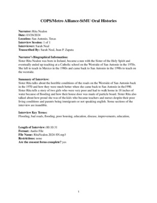 Sister Rita talks about the horrible conditions of the roads on the Westside of San Antonio back in the 1970 and how they were much better when she came back to San Antonio in the1990. Sister Rita tells a story of two girls who were very poor and had to walk home in 18 inches of water because of flooding and how their house door was made of particle board. Sister Rita also talked about how proud she was of the kids who became teachers and nurses despite their poor living conditions and parents being immigrants or not speaking english. Some sections of the interview are inaudible.