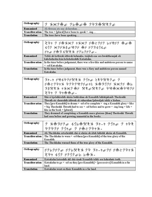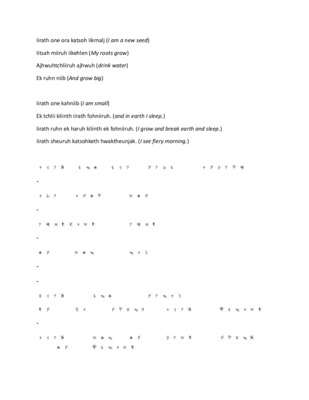 This document contains the origin myth of Theshrahk Thwath’s vegetarianism and relationship with nature. It is presented line-by-line in Theshalshe, the orthography, the romanized form, a transliteration, and an English translation.