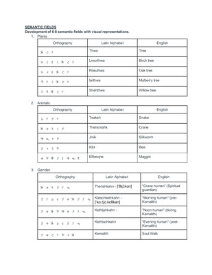 This document contains some the lexicon, verb conjugation patters, plural structures, and nominalization pattern of Theshalshe. The lexicon entries are presented in Theshalshe, romanized form, and a pronunciation guide using the IPA.