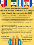 This flyer advertises the Hispanic Heritage Month 2023 Kickoff Event titled "The Past, Present, and Future of St. Mary's as a Hispanic-Serving Institution (HSI)". This event, sponsored by SPARC in collaboration with Mexican American Studies, featured two roundtable conversations with scholars and staff discussing the significance of being an HSI.