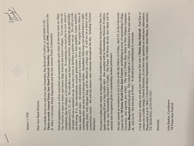 This is a photo of a invite letter for the thirty-seventh Annual Fiesta Jazz Band Festival. This invite is open to Junior and Senior High Schools and Junior Colleges to participate in the 1998 festival.