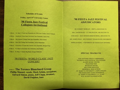 This photo is the event schedule for the 1998 Fiesta Jazz Festival. Highlighting the Collegiate Invitational, the Adjudicators, special thanks to the people who helped out during the festival, and the World Class Jazz Concert by The Terence Blanchard Group.