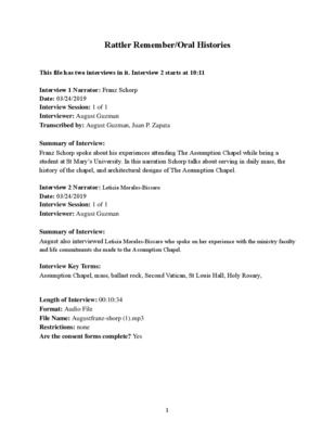 Franz Schorp spoke about his experiences attending The Assumption Chapel while being a student at St Mary’s University. In this narration Schorp talks about serving in daily mass, the history of the chapel, and architectural designs of The Assumption Chapel.