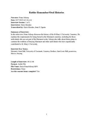 In this interview, Franz Schorp discusses the history of the St Mary’s University Cemetery. He explains the requirements for being buried in the Marianist cemetery, including for those individuals who are not part of the Marianist order. Schorp also talks about future plans to continue the tradition of burying Marianist and other individuals who have significantly contributed to St. Mary’s University.