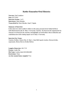 In this interview, Earl Leistikow reflects on the many personal stories behind all those individuals buried in the St. Mary’s University Cemetery. He discusses the requirements for someone to be buried in the cemetery and highlights several Brothers whose dedication and contribution have left a lasting impact on St. Mary’s University.