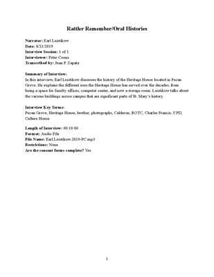 In this interview, Earl Leistikow discusses the history of the Heritage House located in Pecan Grove. He explains the different uses the Heritage House has served over the decades, from being a space for faculty offices, computer center, and now a storage room. Leistikow also highlights various buildings across campus that are significant parts of St. Mary’s history.