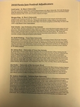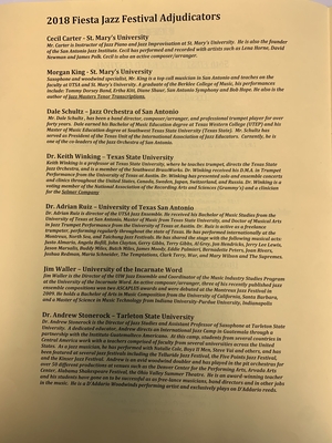 This photo is of the fourth page of the program for the Fiesta Jazz Festival 2018. It features the adjudicators and the clinicians for the festival: Cecil Carter (St. Mary's University), Morgan King (St. Mary's University), Dale Schultz (Jazz Orchestra of San Antonio), Dr. Keith Winking (Texas State University), Dr. Adrian Ruiz (University of Texas San Antonio), Jim Waller (University of the Incarnate Word), and Dr. Andrew Stonerock (Tarleton State University).