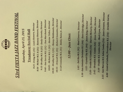 This photo is of the third page of the program for the Fiesta Jazz Festival 2015 held at St. Mary's University in Treadaway Recital Hall. It features the middle school and high school ensembles and a jazz clinic.