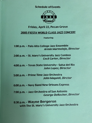 This photo is the event schedule for the 2005 Fiesta Jazz Festival. Highlighting the multiple school performances and the World Class Jazz Concert by Wayne Bergeron with the St. Mary's University Jazz Orchestra.
