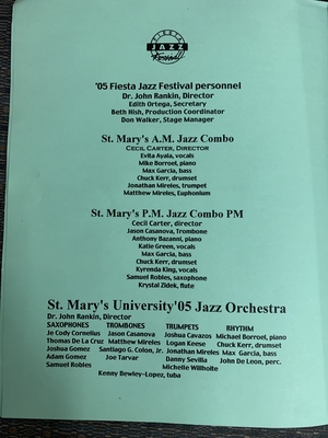 This is a photo of the inside of the 2005 Fiesta Jazz Festival pamphlet. It highlights the personnel, the Jazz Combo A.M. and P.M., and the St. Mary's University 2005 Jazz Orchestra.