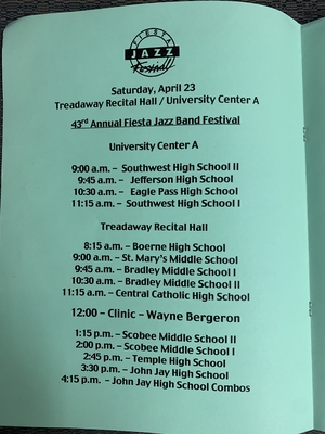 This is a photo of the 43rd Annual Fiesta Jazz Band Festival Schedule on Saturday, April 23, 2005. Having some of its events at Treadaway Recital Hall and the University Center A.