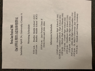 This is a photo of the morning and afternoon schedule for the 42nd Annual Fiesta Jazz Band Festival on Saturday, April 24, 2004.