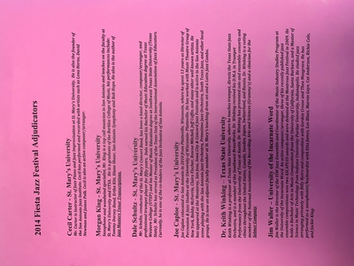 This photo is of the fourth page of the program for the Fiesta Jazz Festival 2014 held at St. Mary's University. It features the adjudicators who judged at the festival, Cecil Carter (St. Mary's University), Morgan King (St. Mary's University), Dale Schultz (St. Mary's University), Joe Caploe (St. Mary's University), Dr. Keith Winking (Texas State University), and Jim Waller (University of the Incarnate Word).