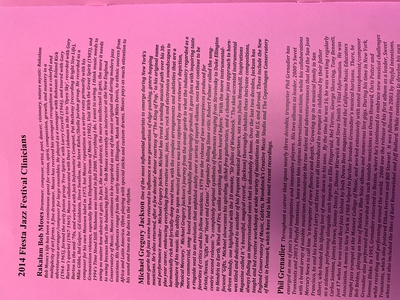 This photo is of the fifth page of the program for the Fiesta Jazz Festival 2014 held at St. Mary's University. It features the clinicians that held clinics at the festival, Rakalam Bob Moses, Michael Gregory Jackson, and Phil Grenadler.