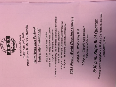 This photo is of the second page of the program for the Fiesta Jazz Festival 2019 held at St. Mary's University in Pecan Grove. It features the university ensembles, Wednesday Ball, The Bill King Quartet and The Rufus Reid Quartet.