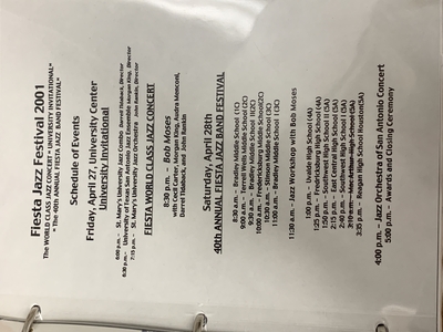 This photo is an updated version of the event schedule for the 2001 Fiesta Jazz Festival on Friday and Saturday. Still Highlighting the University Invitational, Annual Fiesta Jazz Band Festival, and the World Class Jazz Concert by Bob Moses.