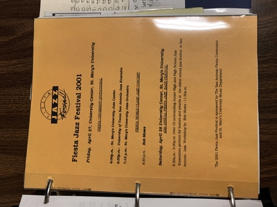 This photo is the event schedule for the 2001 Fiesta Jazz Festival for Friday and Saturday. Highlighting the University Invitational, Annual Fiesta Jazz Band Festival, and the World Class Jazz Concert by Bob Moses.