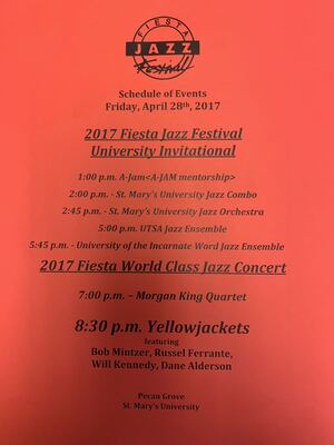 This photo is of the second page of the program for the Fiesta Jazz Festival 2017 held at St. Mary's University in Pecan Grove. It features the university ensembles, the Morgan King Quartet, and the YellowJackets.