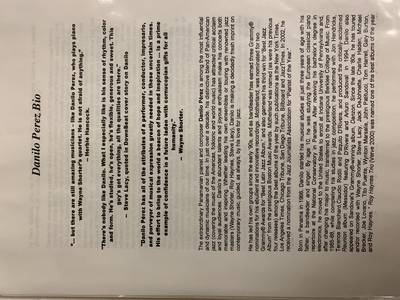 Page two of the information about the guest performer for the Fiesta Jazz Festival, Danilo Perez.