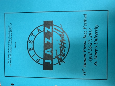 This is a photo of the first page of the program for the Fiesta Jazz Festival 2013 held at St. Mary's University by the St. Mary's University Department of Music, The Fiesta San Antonio Commission, and KRTU 91.7.