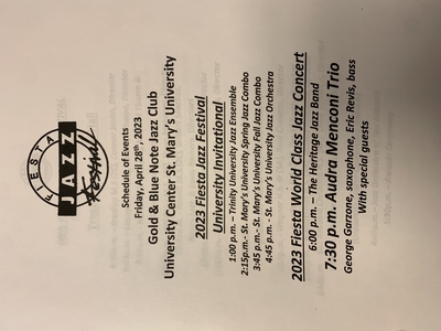 This photo is the event schedule for the 2023 Fiesta Jazz Festival for Friday 23, 2023. Highlighting the University Invitational and the World Class Jazz Concert by Audra Menconi Trio.
