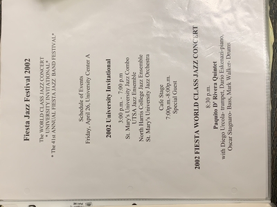 This photo is the event schedule for the 2002 Fiesta Jazz Festival. Highlighting the University Invitational and the World Class Concert by Paquito D' Rivera Quintet.